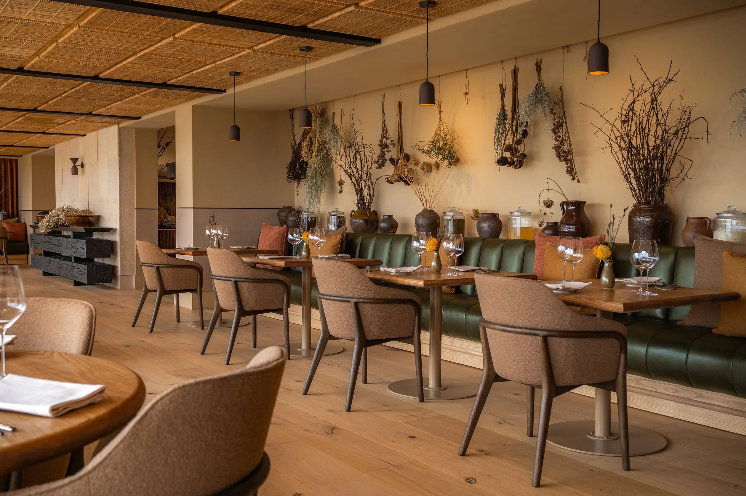The refreshed interior of Hidden Valley Restaurant is designed as a gentle counterpoint to its expansive views over the Stellenbosch Valley. Inside, earthy tones, soft leather banquettes and layered textures create a sense of warmth and enclosure, allowing the landscape beyond to remain the focal point. Timber, woven ceilings and tactile finishes add depth and quiet character, while carefully scaled seating encourages intimacy. The result is a calm, contemporary dining space where interior and view work together, inviting guests to slow down and linger.